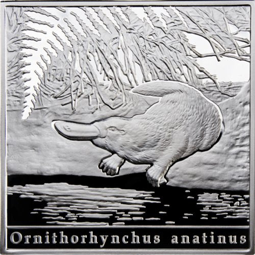 Dziobak - fascynujący australijski gatunek ssaka, będący wielką zagadką zoologiczną, posiadającą wiele cech ptasich, takich jak: dziób, czy jajorodność - przedstawiony na niskonakładowej, srebrnej monecie z kolekcji "Osobliwości