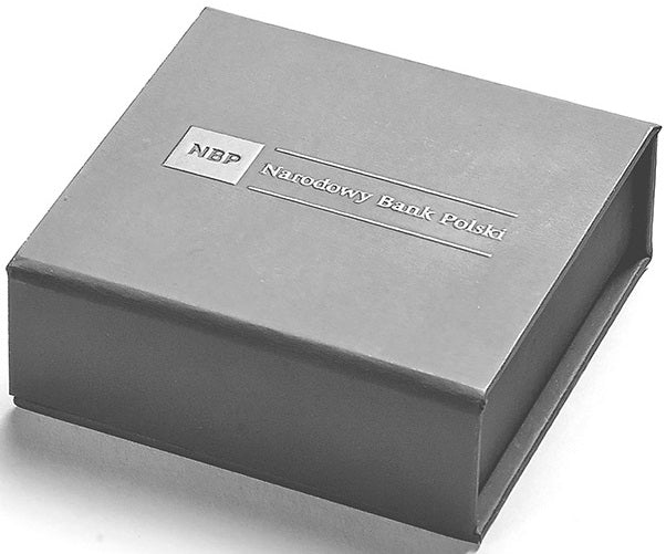 srebrna moneta w kapsule ochronnej, certyfikat autentyczności, pudełko