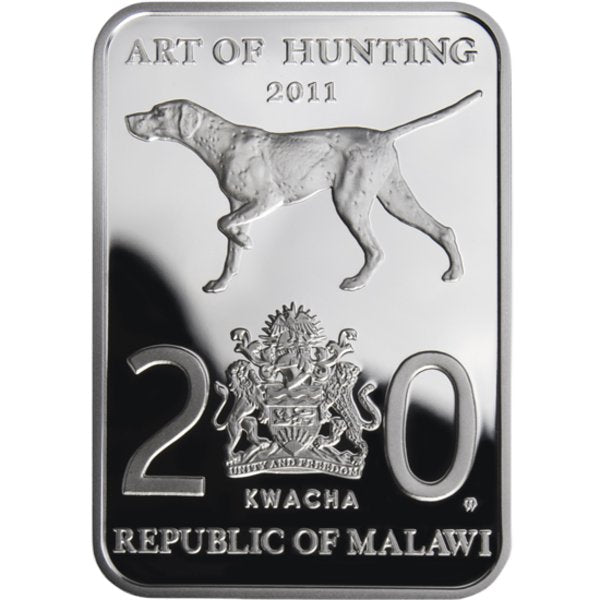 W górnej części monety - napis w języku angielskim Art of Hunting (Sztuka polowania). Poniżej - wizerunek psa rasy pointer w pozycji myśliwskiej. W dolnej części - nominał 20 kwacha, pod nim znak menniczy MW, między cyframi nominału godło państwowe Republiki Malawi. Poniżej nazwa emitenta w języku angielskim - Republic of Malawi.