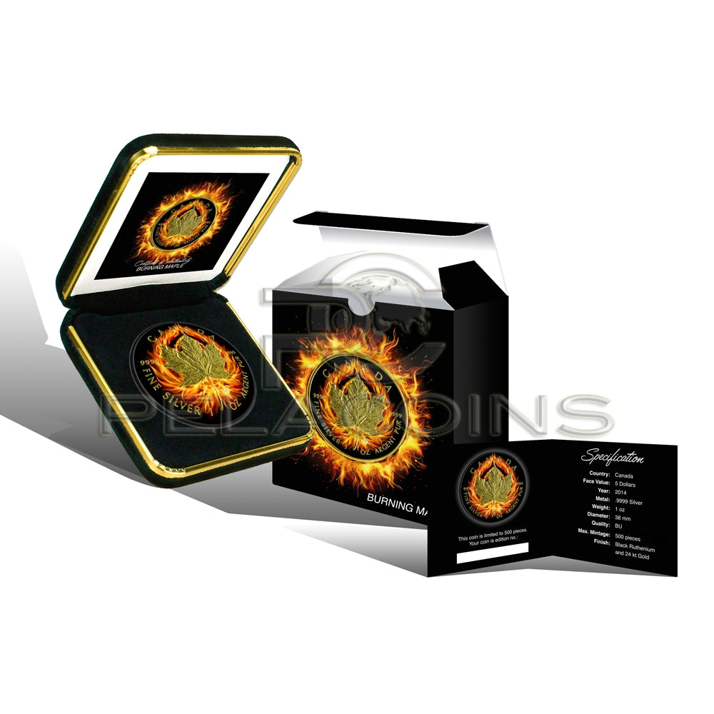 Canada 2015 5$ Burning Maple Leaf Fire Black Ruthenium 1 Oz Silver Coin