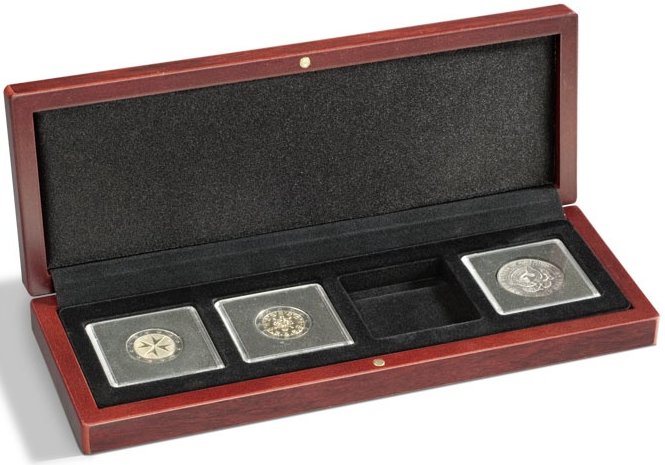 etui służy do estetycznego wyeksponowania 4 monet - np. na prezent,można w nim bezpiecznie przechowywać 4 monety o średnicy od 14 do 41 mm,do monet należy dokupić specjalne kapsle Quadrum o wymiarach 50x50 mm