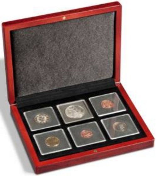 etui służy do estetycznego wyeksponowania 6 monet - np. na prezent,można w nim bezpiecznie przechowywać 6 monet o średnicy od 14 do 41 mm,do monet należy dokupić specjalne kapsle Quadrum o wymiarach 50x50 mm