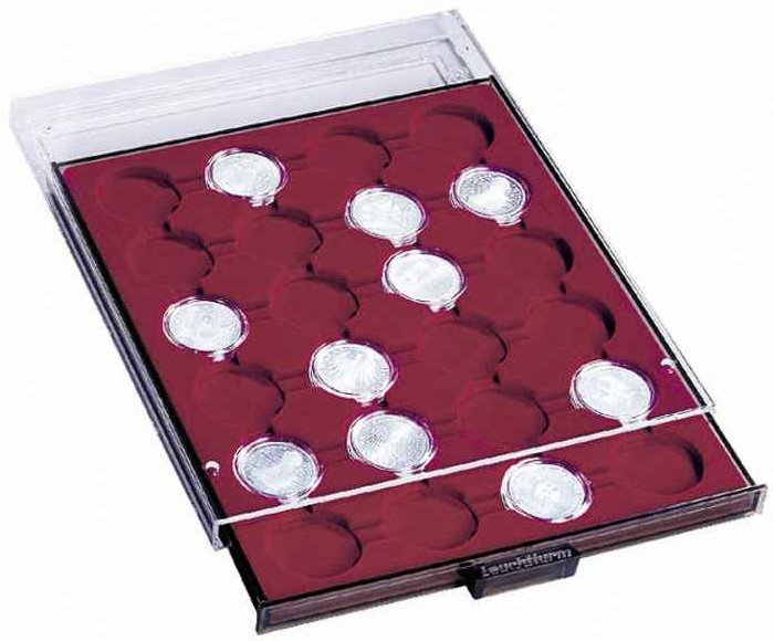 przeznaczona jest do przechowywania i estetycznego wyeksponowania złotych monet kolekcjonerskich o nominale 200 zł AU w kapslach,ułatwia transport i umożliwia bardzo wygodne przenoszenie Twojej kolekcji,posiada 35 miejsc na monety o średnicy 27,00 mm,wymiary kasety: 236 x 303 x 20 mm,kolor wkładu: ciemnoczerwony,dzięki specjalnym "nóżkom" do łączenia kaset, kasety można układać pionowo,ponadto do kaset można dokupić specjalne kufry firmy Leuchtturm, które zamykane są na kluczyk i przeznaczone do przechowywania 5 lub 10 kaset.