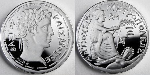 Jednym z numizmatów wybitych przez Mennicę Polską S.A. jest Stater Antiochii syryjskiej (27 p.n.e. - 14 n.e.), czyli srebrna moneta,