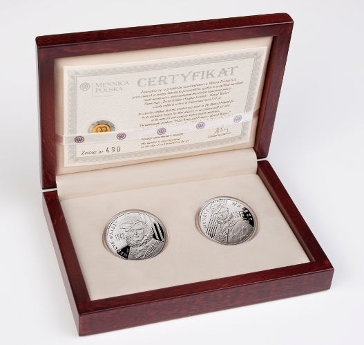 dwa srebrne numizmaty z numerem certyfikatu wybitym na